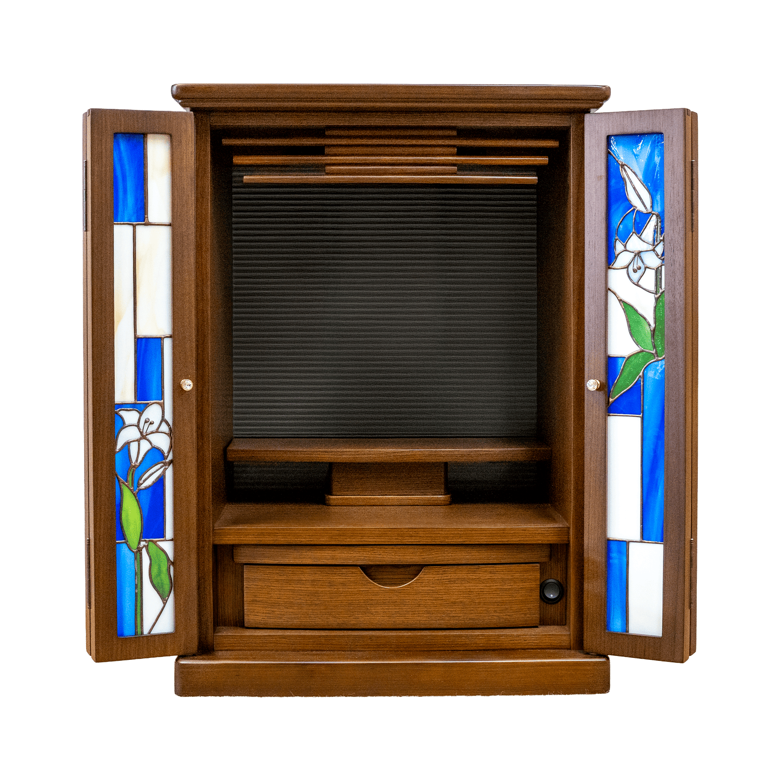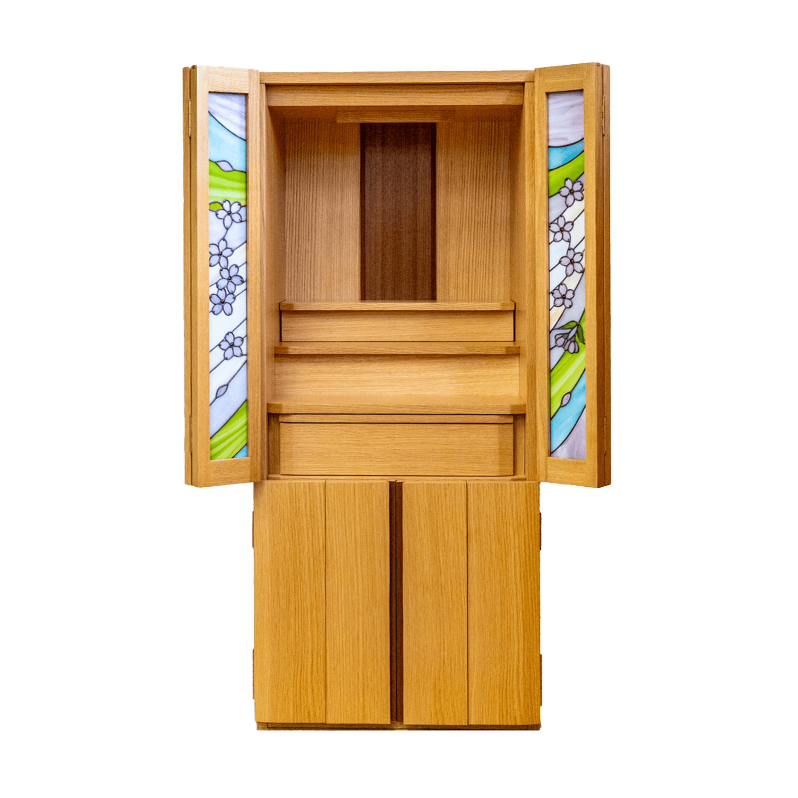 マンションやアパートにもぴったり。作家によるオリジナルステンドグラスをはめこんだ、床置きタイプの仏壇。収納も充実しています。