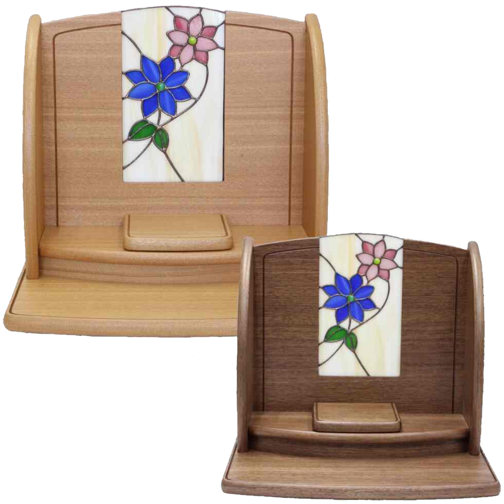 ステージタイプの扉のないお仏壇に作家さんオリジナルのステンドグラスを仕込みました。置き場所を選ばないコンパクトなお仏壇です。