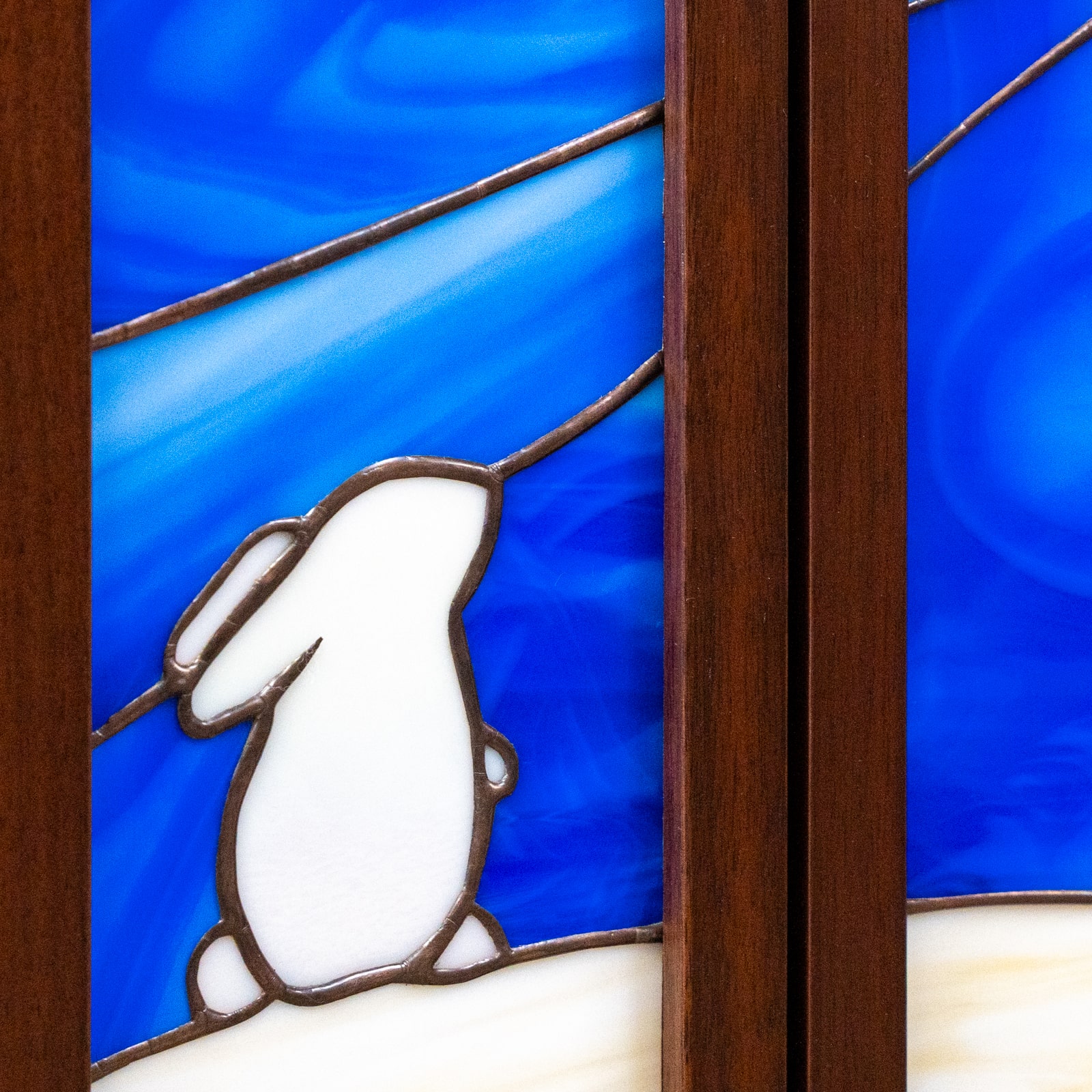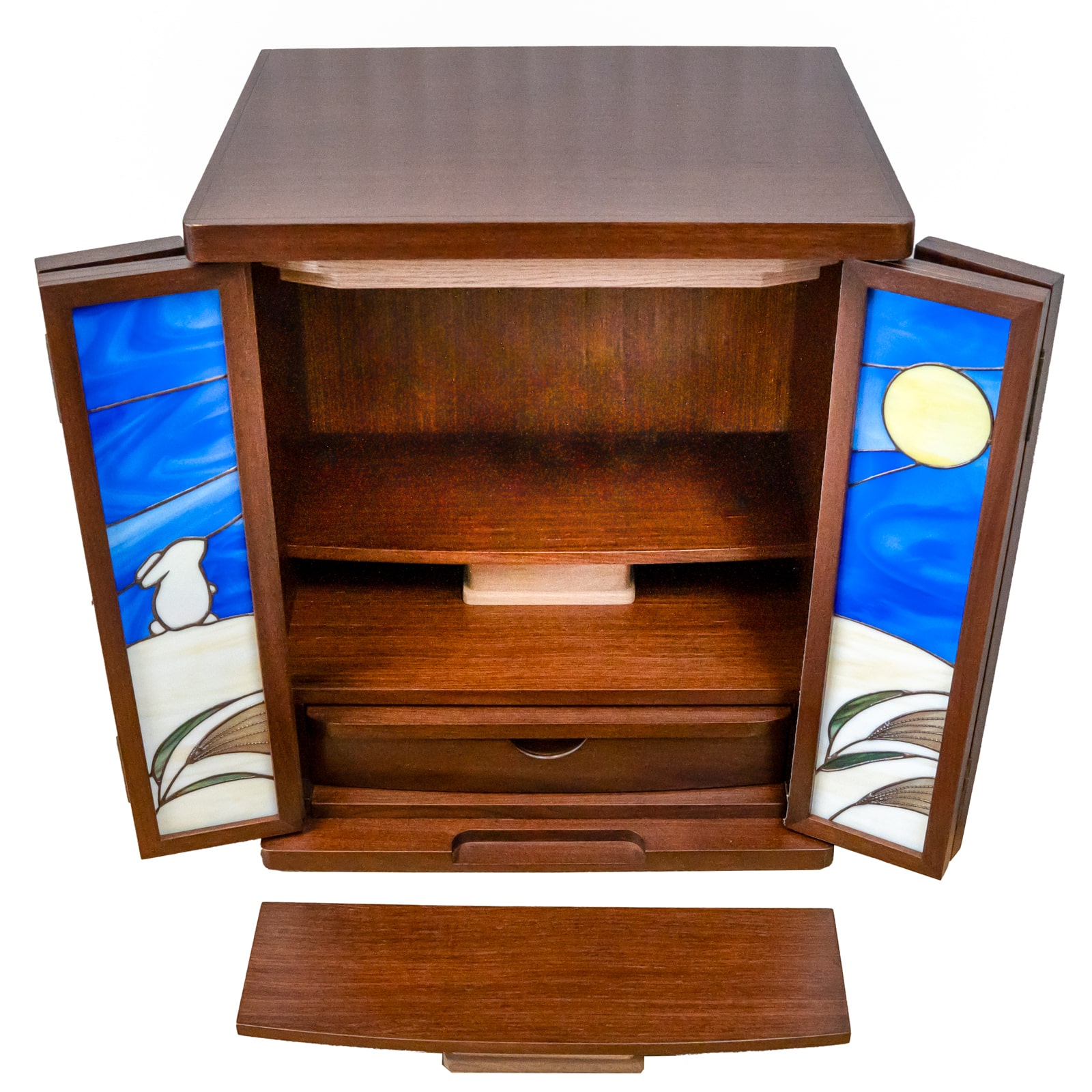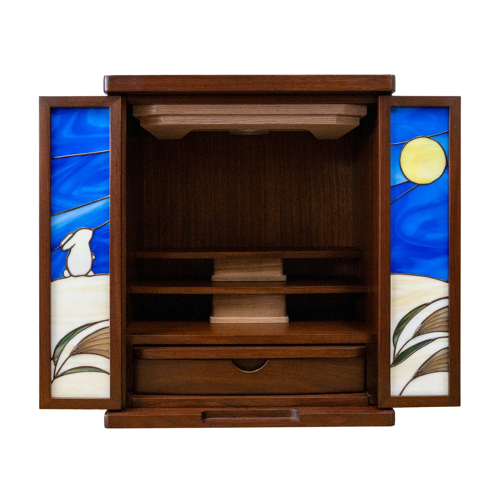 特徴 | 月とウサギをテーマにしたステンドグラス仏壇です。 仏壇のダークブラウンカラーに、明るいブルーを基調にしたオリジナルステンドグラスがよく映えます。 もちろんステンドグラスは作家による一点もの。 仏壇は「膳引き」と「引き出し」が一緒に手前にスライドする構造で、膳引きを引いた状態でも引き出しが利用しやすくなっています。 |