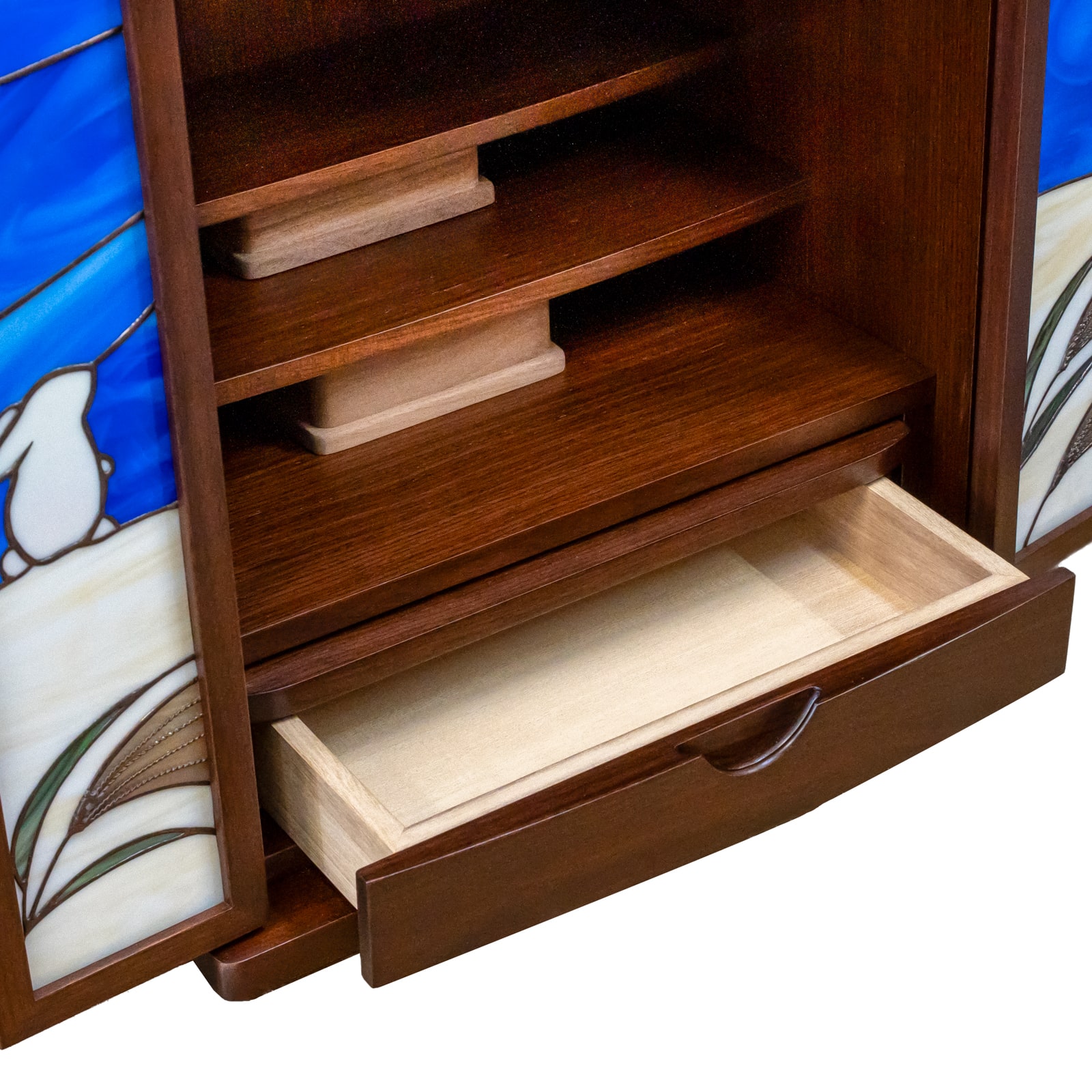 可愛らしいうさぎのステンドグラスは作家による一点ものです。「膳引き」と「引き出し」が使いやすくなっています。