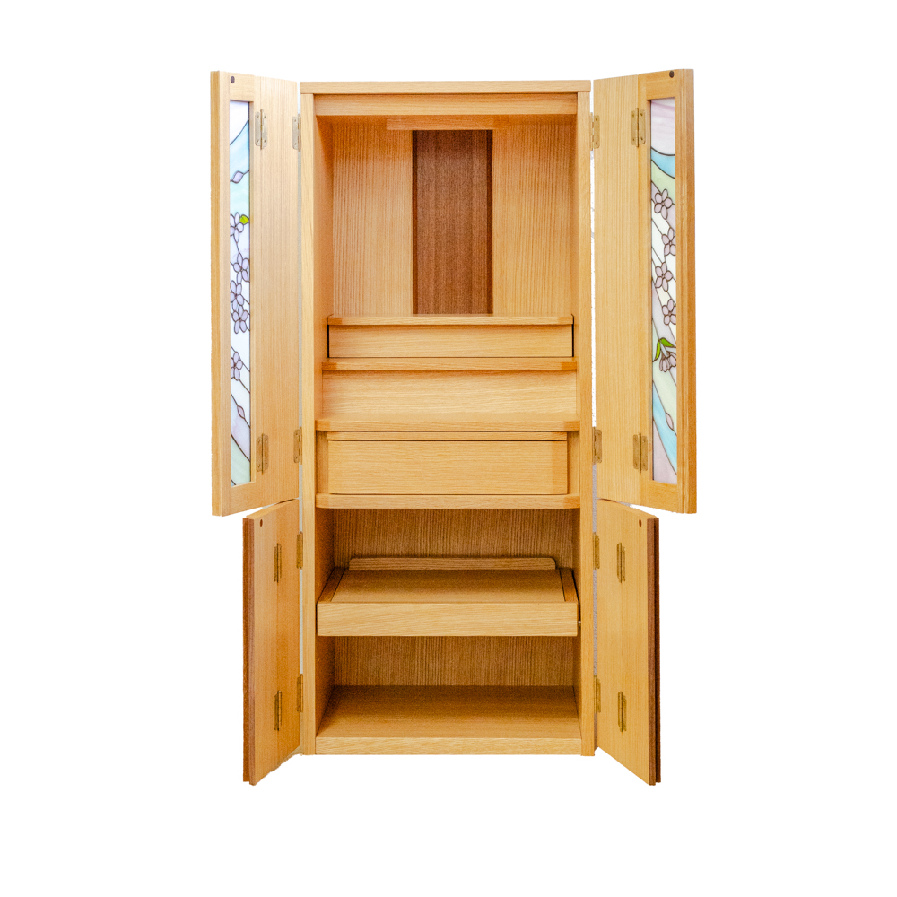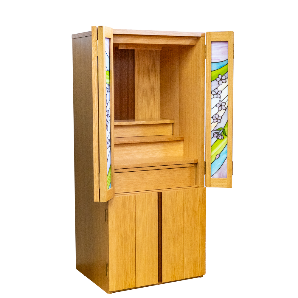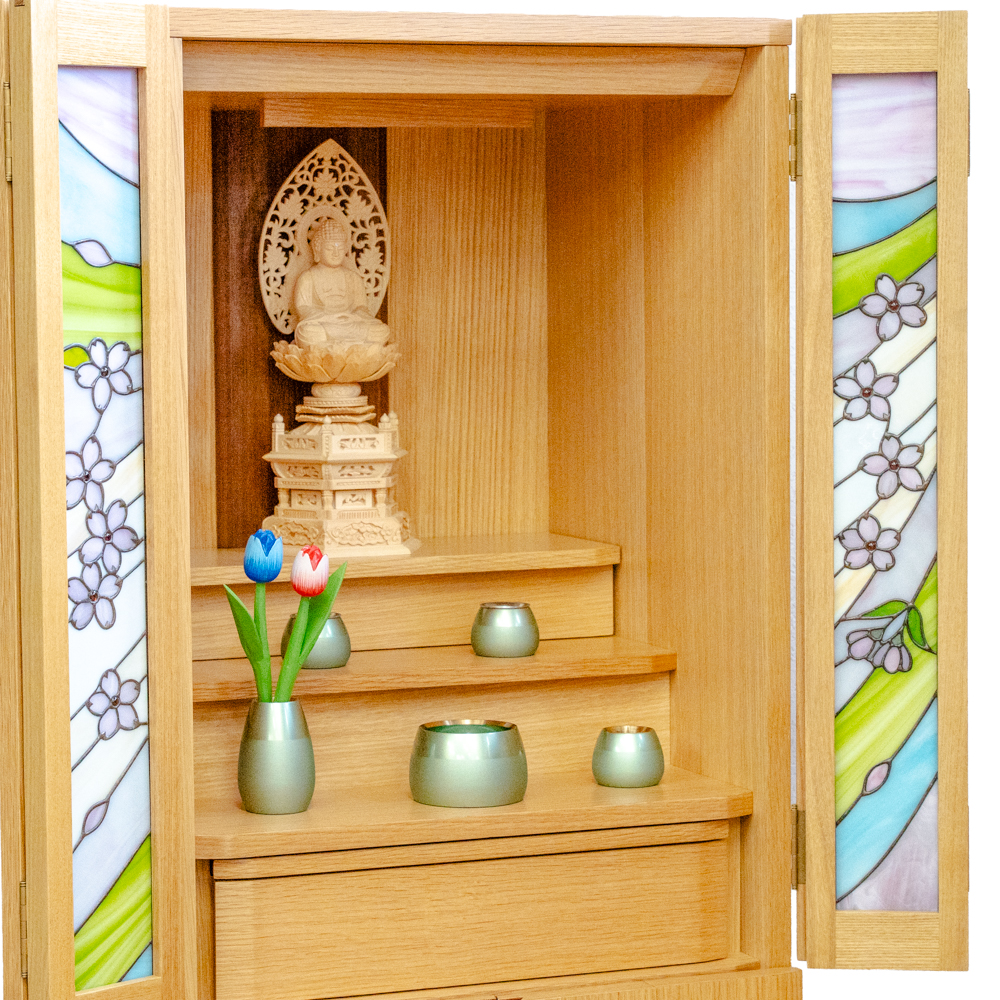 特徴 | 床置きタイプのお仏壇に作家によるオリジナルステンドグラスをはめこんだ、おしゃれな仏壇です。 上下に分かれない一体型で、床に置くタイプですが高さが105cmと小型で、マンションやアパートにもぴったり。 ホワイトオークの明るい仏壇に、軽やかな桜の柄が映える仏壇です。 |