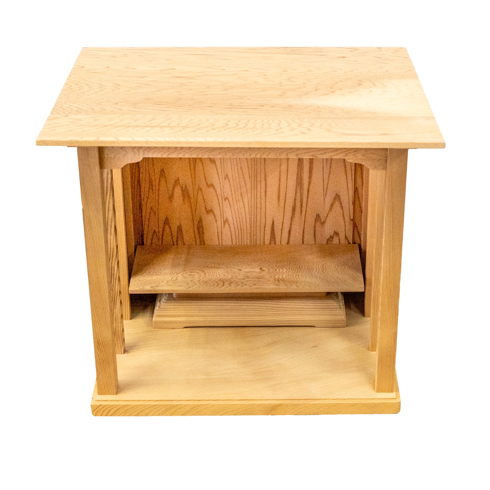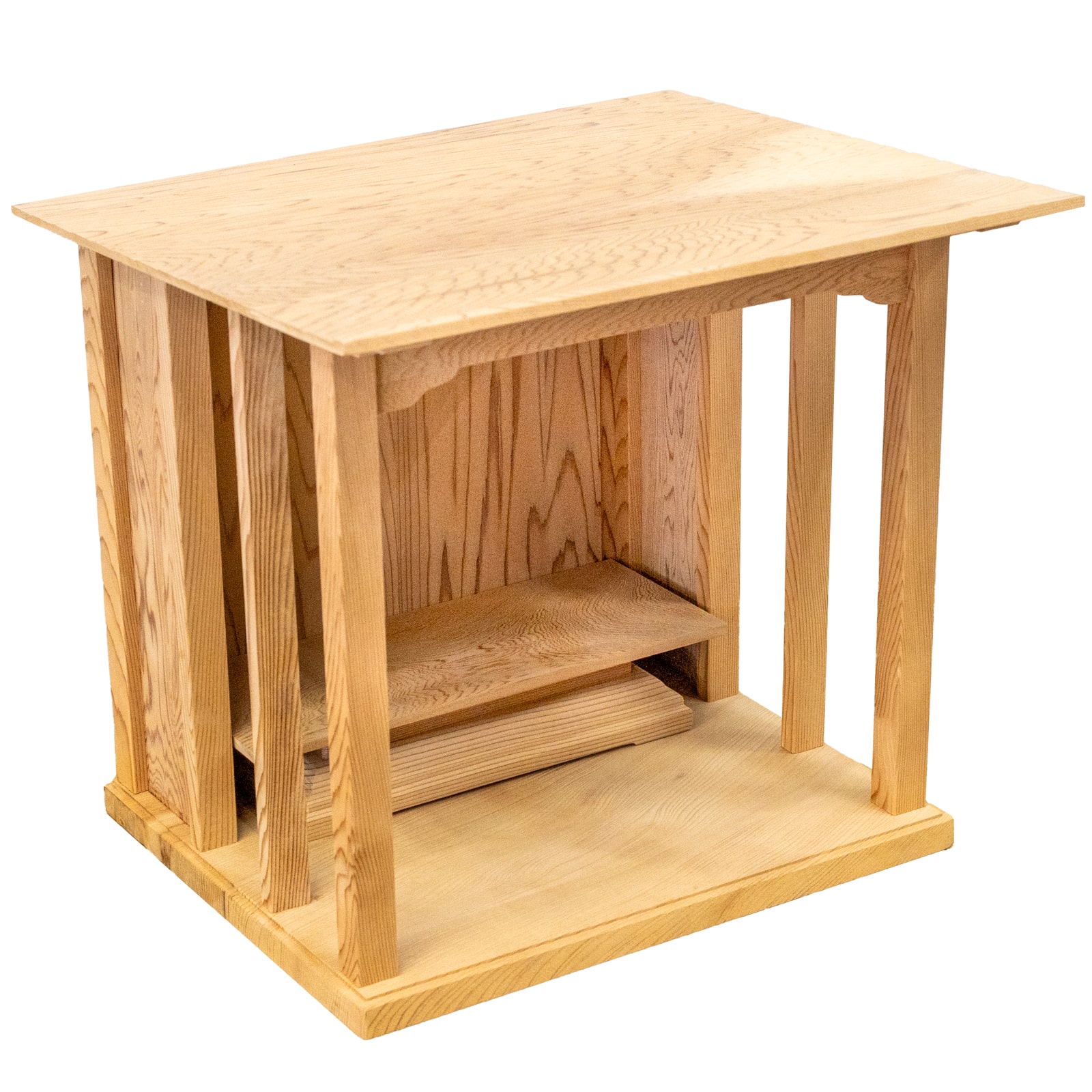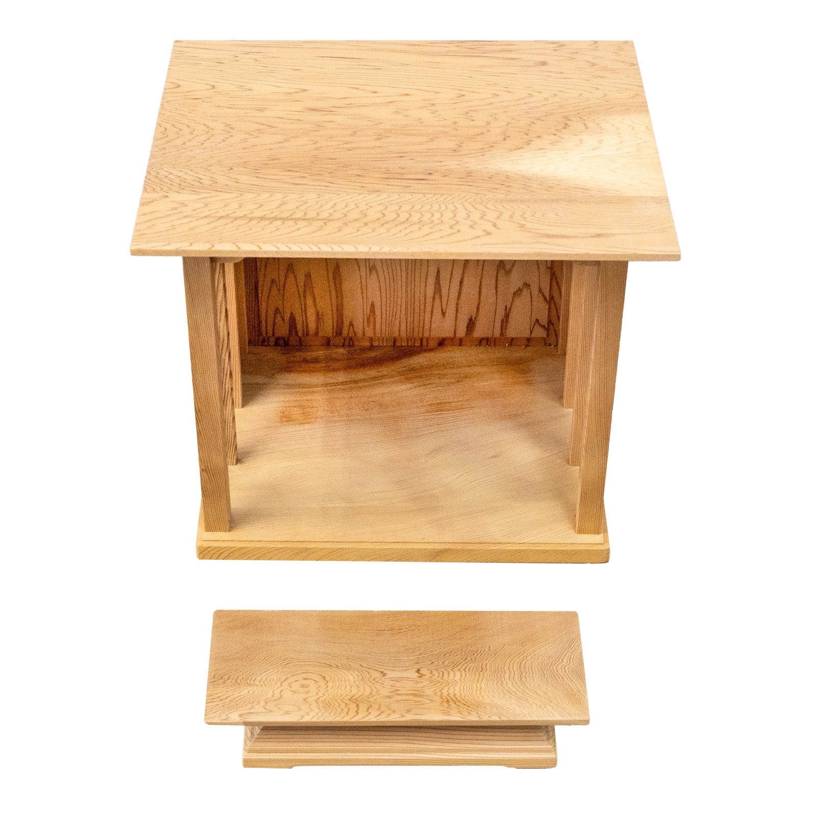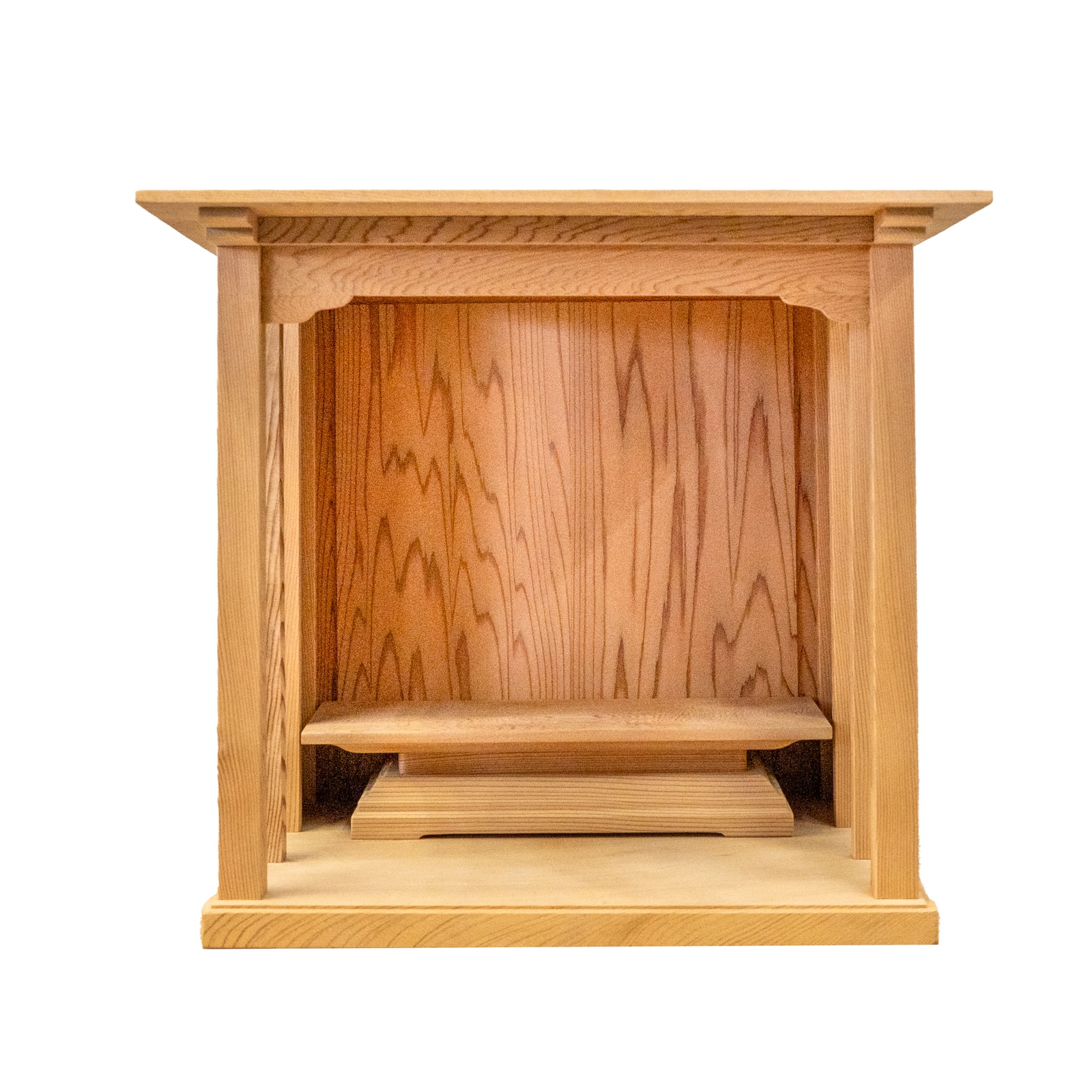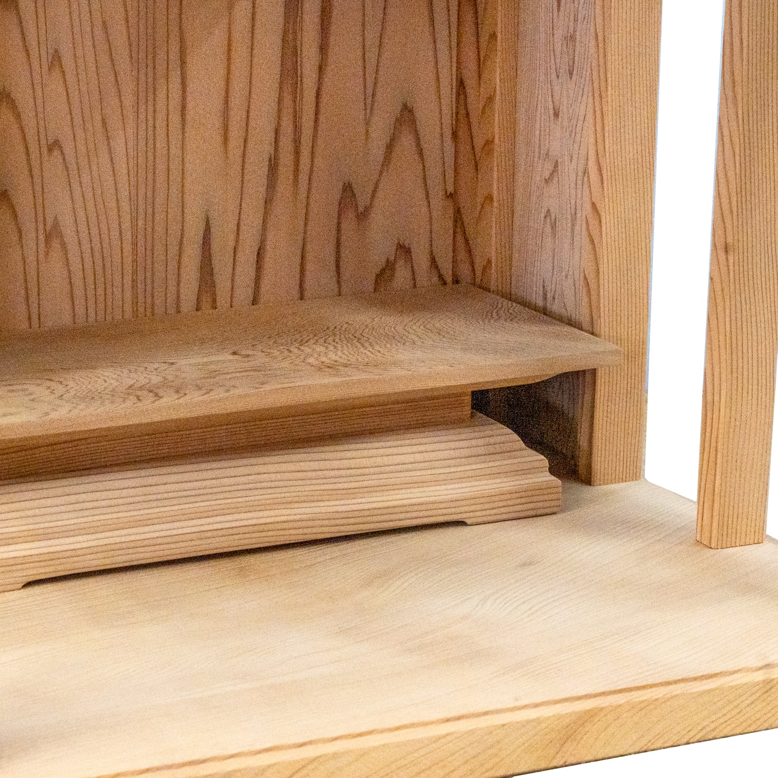 特徴 | 貴重な屋久杉材を使用し、木目の美しさが際立つ上質なオリジナル仏壇です。軽量で扱いやすく、扉を持たない開放的なデザインが特長。暮らしの空間に自然に溶け込み、心地よい祈りの場を演出します。 |