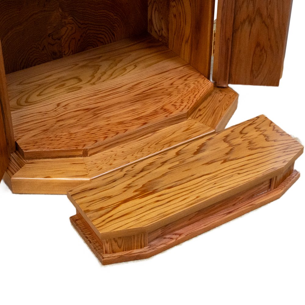 特徴 | 店主自ら貴重な屋久杉の無垢板を買い付け、熟練の仏壇職人に製造を依頼しました。屋久杉材は現在きわめて稀少であり、特にこれほど美しい木目をもつ材はほとんど出回っていません。 このオリジナル仏壇は、すべて屋久杉の無垢板(無垢板を2〜3枚貼り合わせた部分有り)から仕上げられ、製造から塗装に至るまで静岡の職人による丁寧な仕事で完成しました。どの角度からご覧いただいても、屋久杉ならではの優雅な木目が際立つ逸品です。大切な祈りの場にふさわしい一台として、ぜひご検討ください。 |