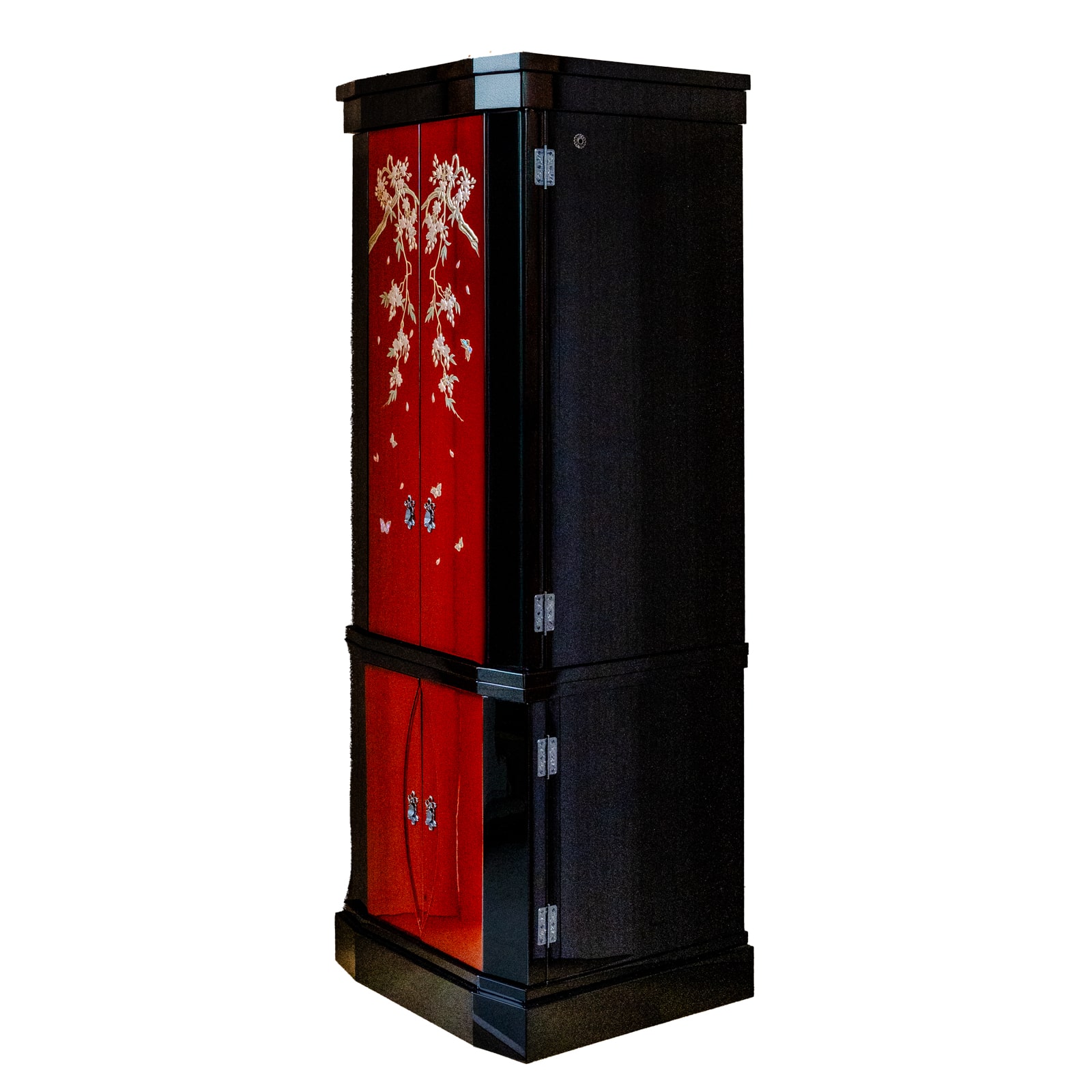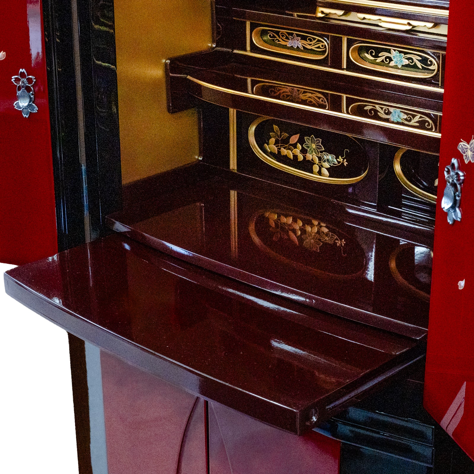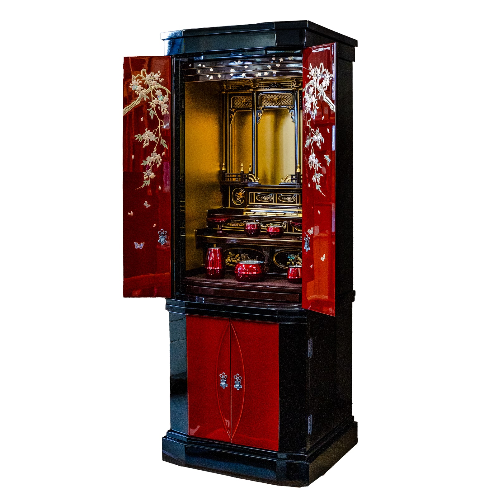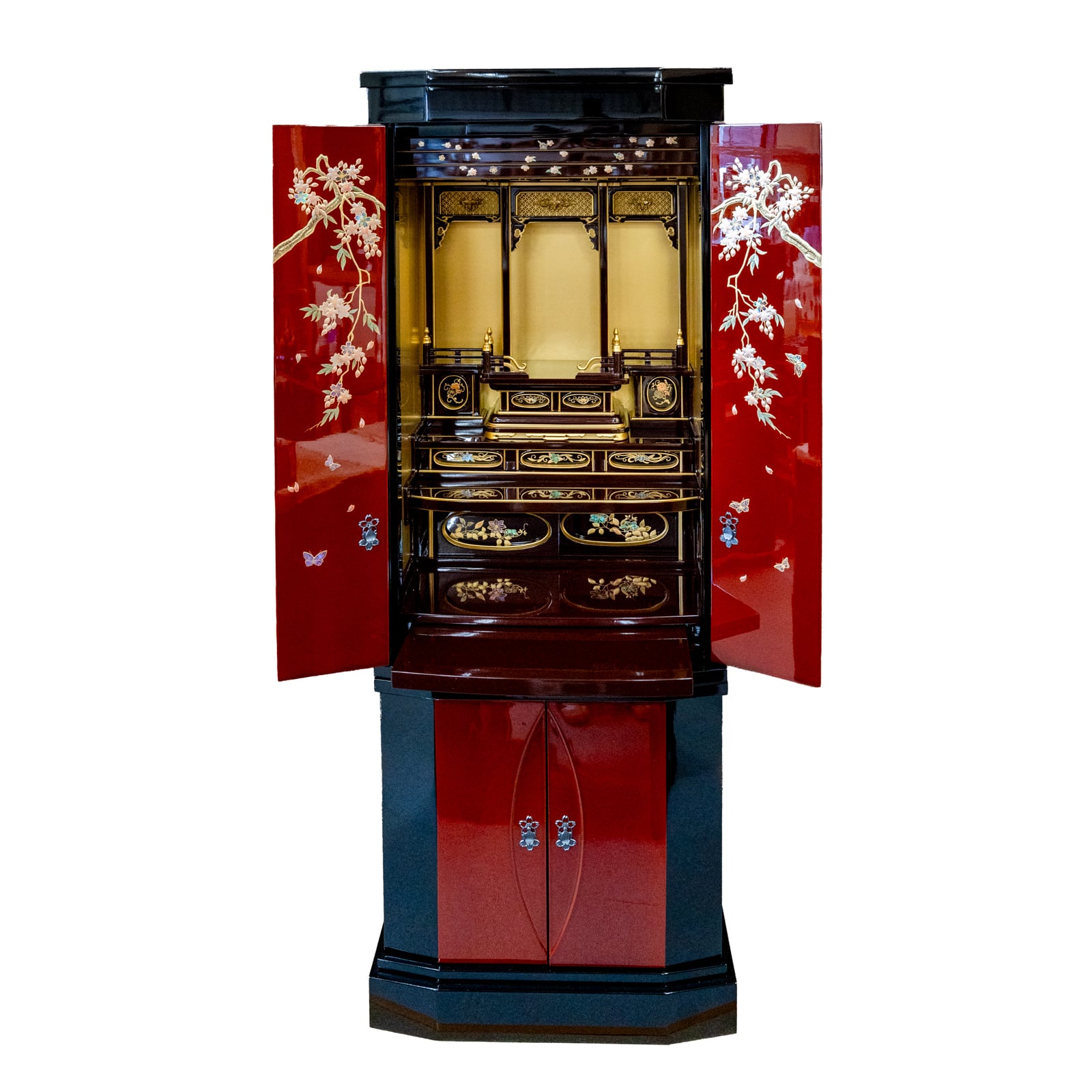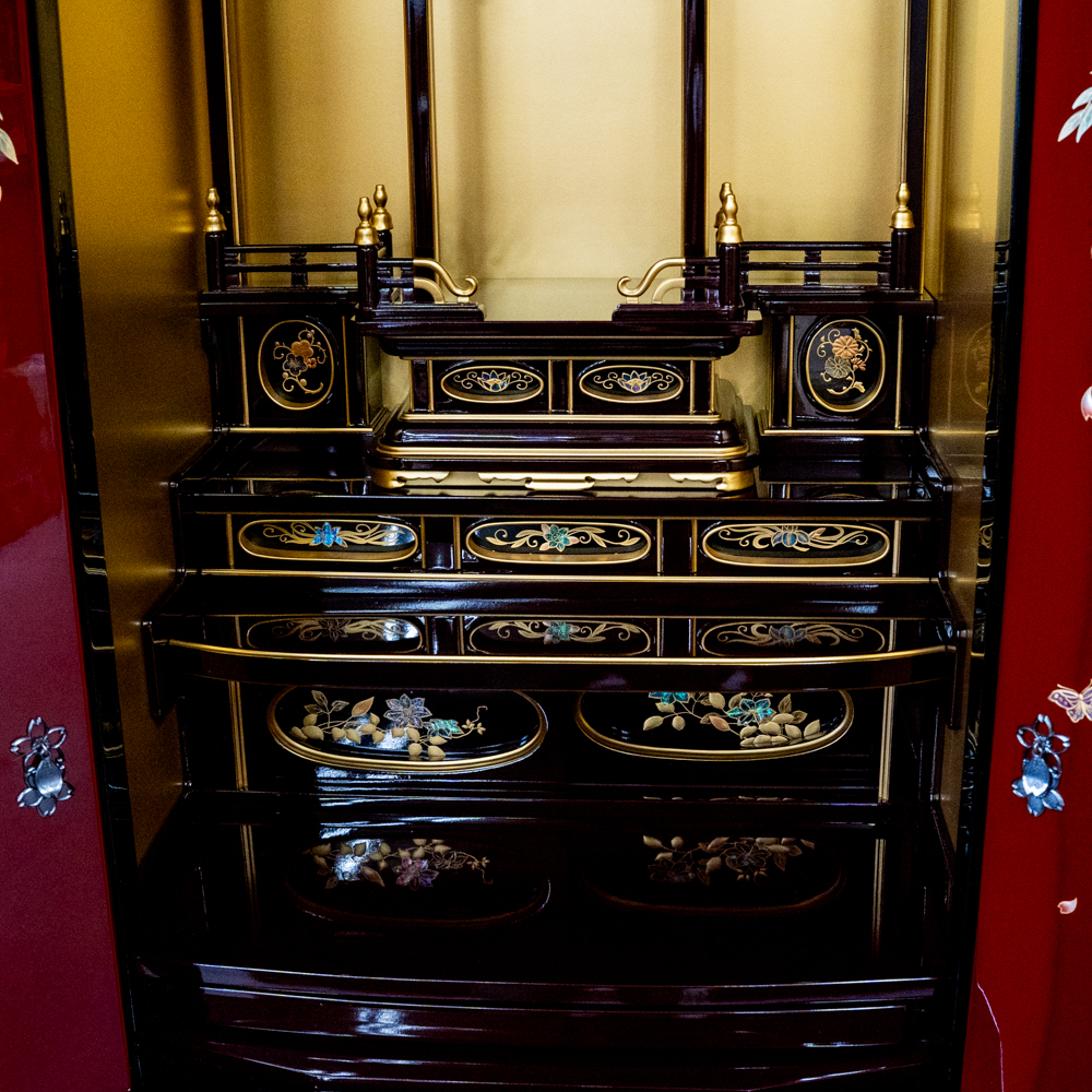 特徴 | 日本の職人が手がけ、日本の蒔絵師が描き上げた本格的な仏壇。単なる祈りの場を超え、工芸品としての美しさを備えています。 当店では店舗販売はもちろん、県外からもご用命をいただく人気の逸品です。内部最上段の棚は、お位牌をゆとりをもってお祀りいただけるよう、柱の位置を当店仕様に改良しました。 確かな技術で仕上げられた本格的な塗りのお仏壇をお探しの方に、自信をもっておすすめいたします。 |